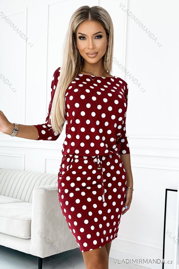 A sporty dress with a tie, pockets, a boat neckline and 3/4 sleeves - burgundy with white polka dots. Made of pleasant to the touch elastic material. Numoco brand. Polish production.