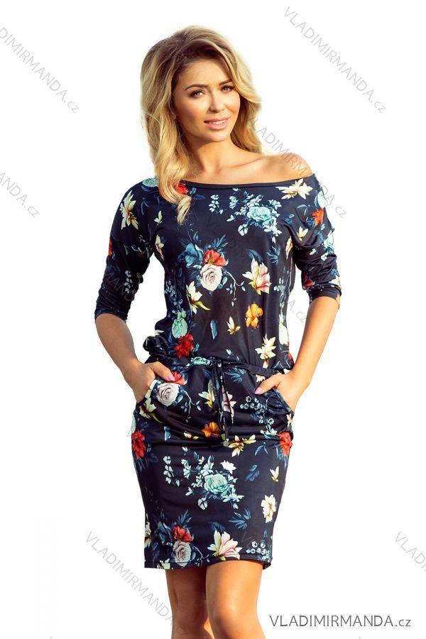 Sports dress with 3/4 sleeves and pockets - colorful flowers on a dark blue background. When choosing the size, follow the circumference of the hips. Polish production.