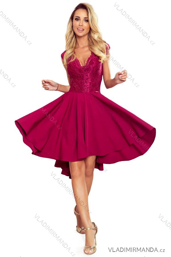 Patricia - exclusive asymmetrical dress with longer back, short sleeves, neckline and lace - burgundy color. A skirt with longer back will be perfect for dancing. Polish production. Numoco brand.