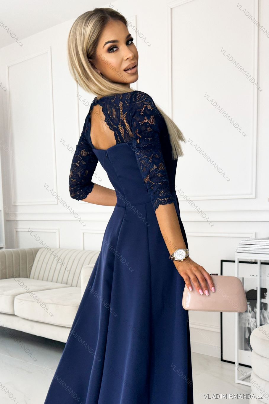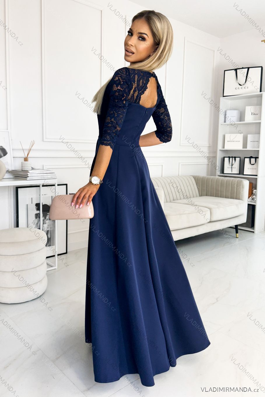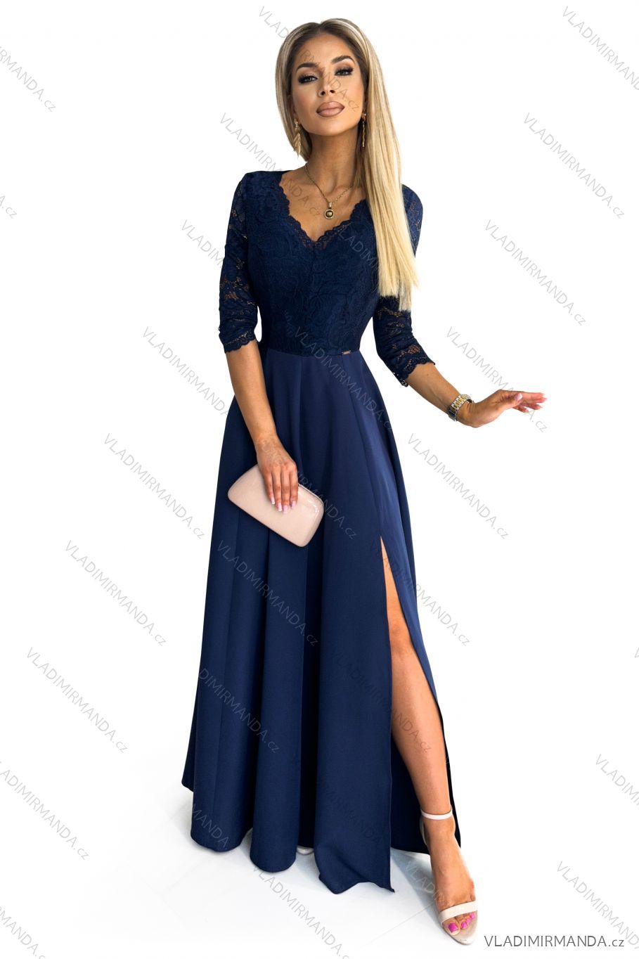 309-6 AMBER elegant lace long dress with a neckline - navy blue