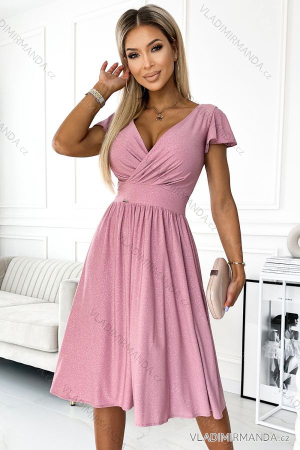 425-2 MATILDE Dress with a neckline and short sleeves - powder pink with glitter