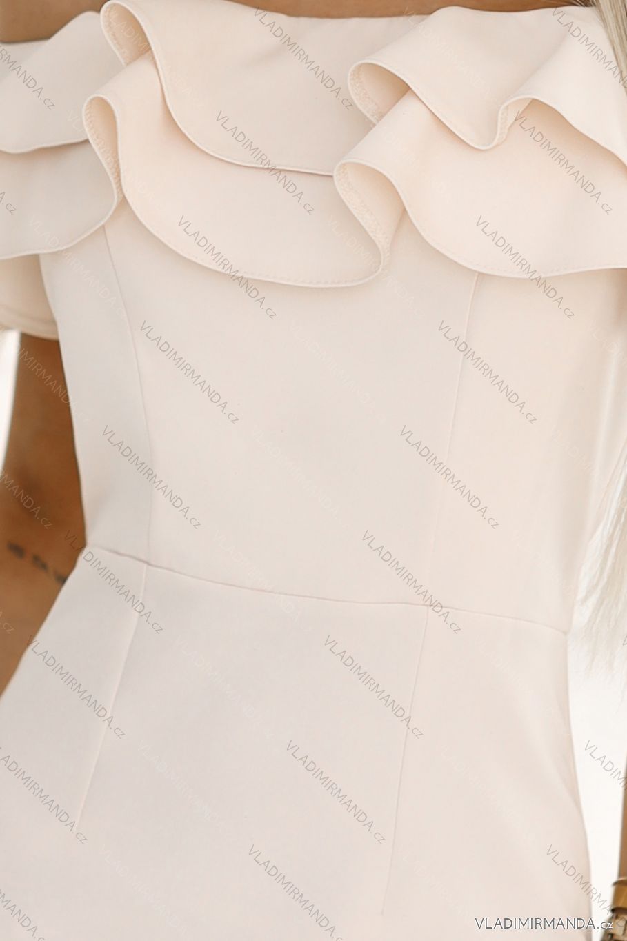 This enchanting off-shoulder dress with exposed shoulders and double ruffle is designed for women who appreciate subtle charm and chic appearance. Made of high-quality, pleasant to touch material in light beige color, it perfectly emphasizes the silhouette and is suitable for many occasions - from family celebrations to romantic dinners.