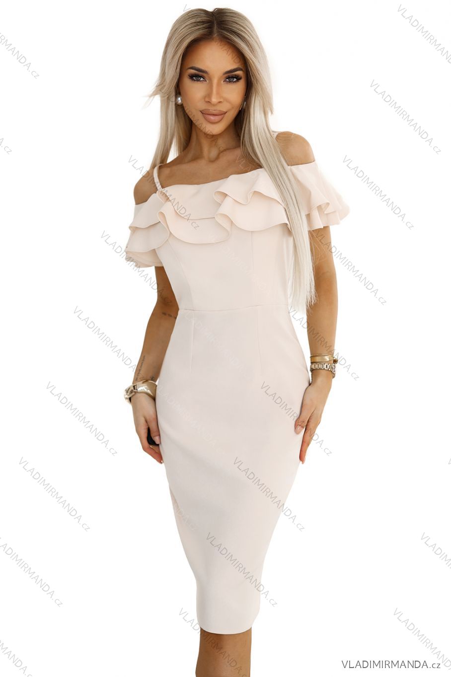 Elegant Spanish dress with frills in light beige. Midi style, bare shoulders, feminine cut. Numoco brand. Polish product. Perfect for a wedding, date and celebration.