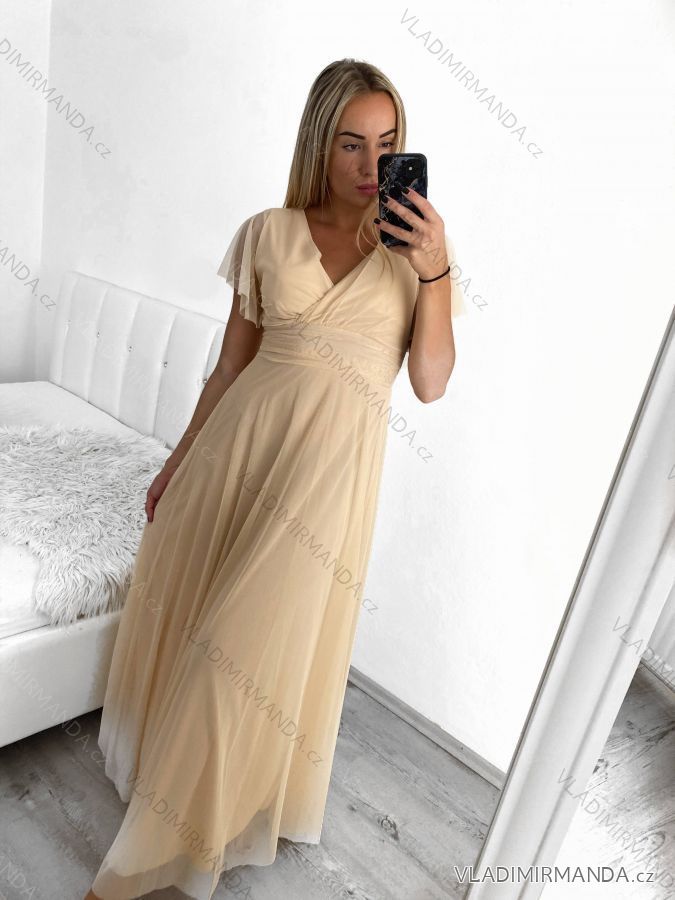 Women's Long Chiffon Short Sleeve Dress (S/M ONE SIZE) ITALIAN FASHION IMWGM23456 beige XS/S/M