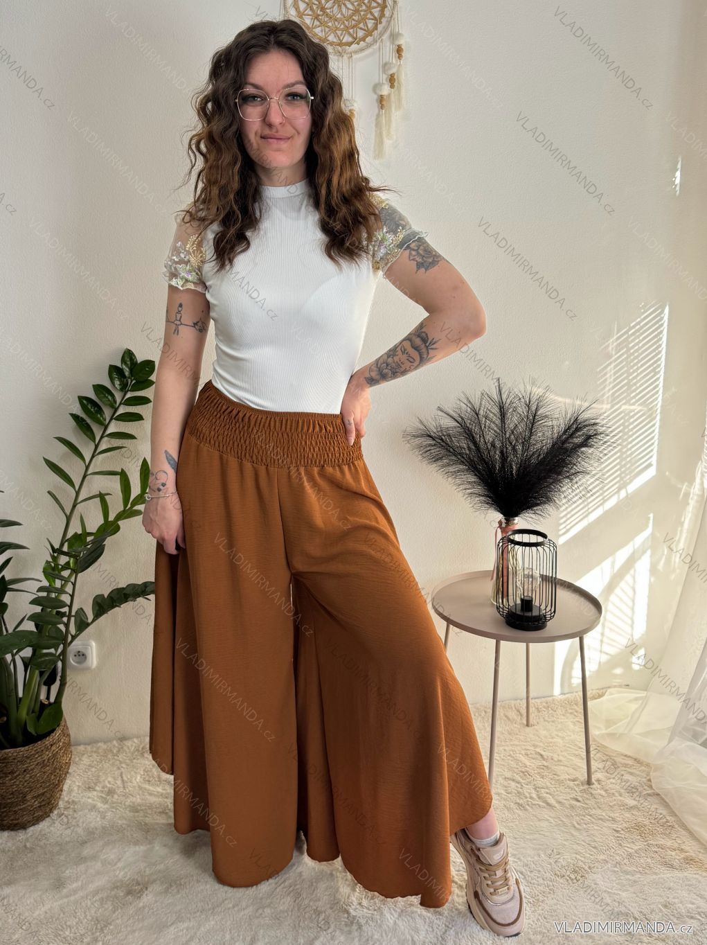 Široký střih kalhot s žabičkováním v pase lichotí postavě a dodává kalhotám sukňový vzhled. Díky tomu jsou kalhoty ideální pro různé příležitosti, od ležérního nošení po letní večírky.